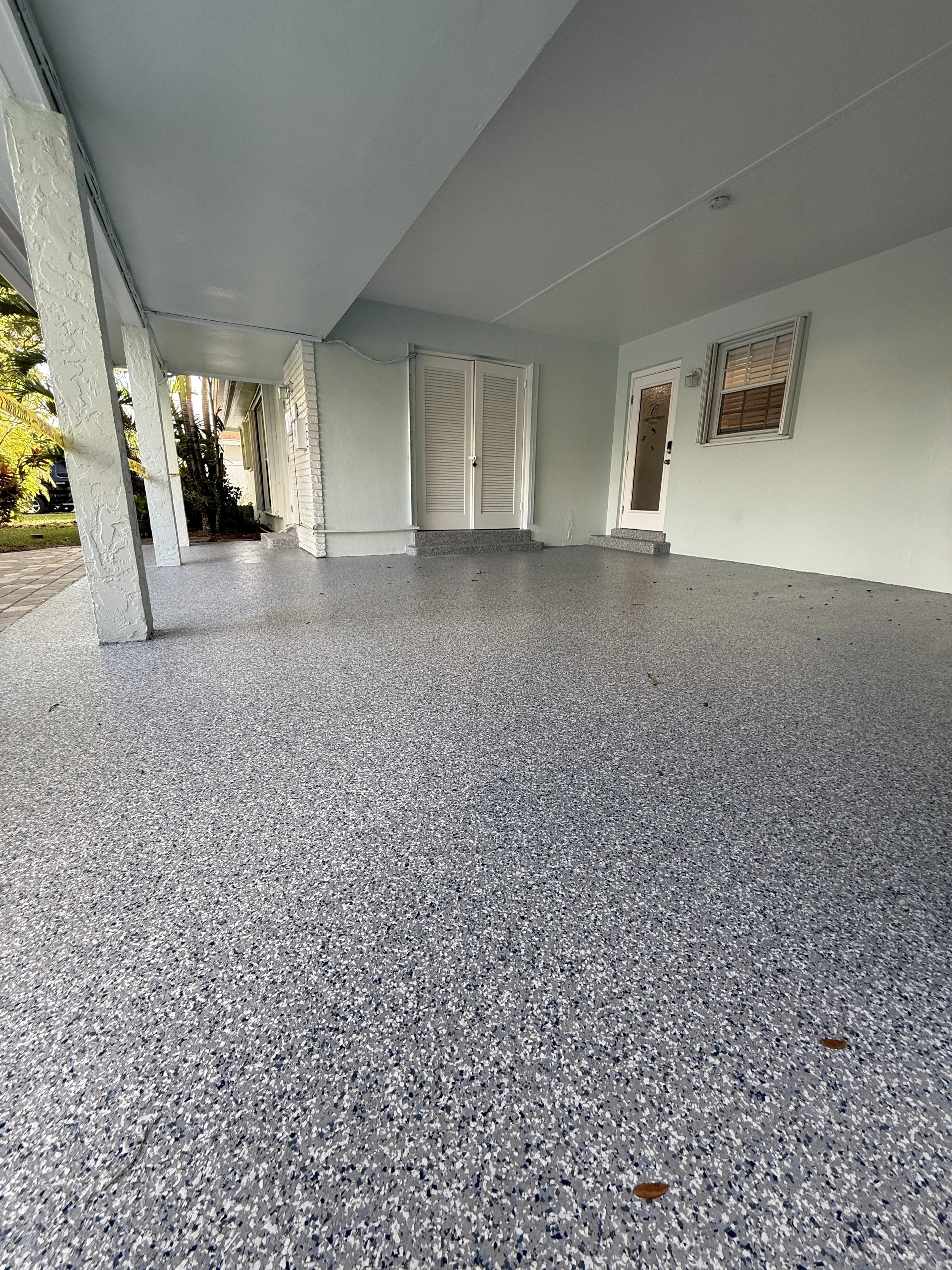 Our process includes surface preparation, a high-performance epoxy base coat, decorative vinyl flakes for texture and design, and a protective clear topcoat. The result is a non-porous, stain-resistant floor that stands up to daily traffic, spills, and impact while still looking modern and clean.